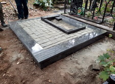 Когда подготовительные работы на территории могилы были завершены, мы принялись за укладку брусчатки на пескобетон, сама плитка была уложена вровень с облицованным гранитными плитами цоколем. Параллельно с этим мы подготовили основание для последующей установки надгробья.